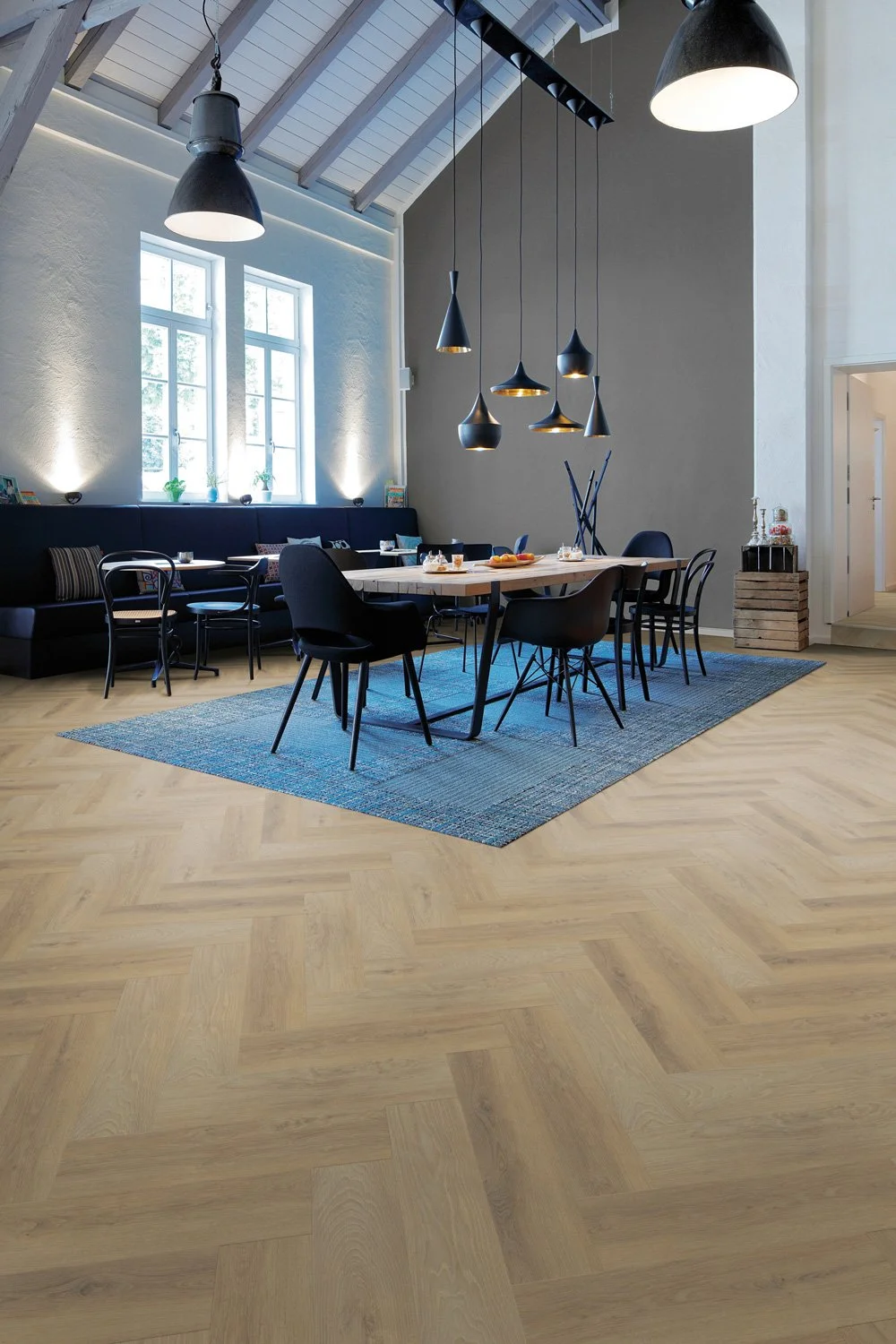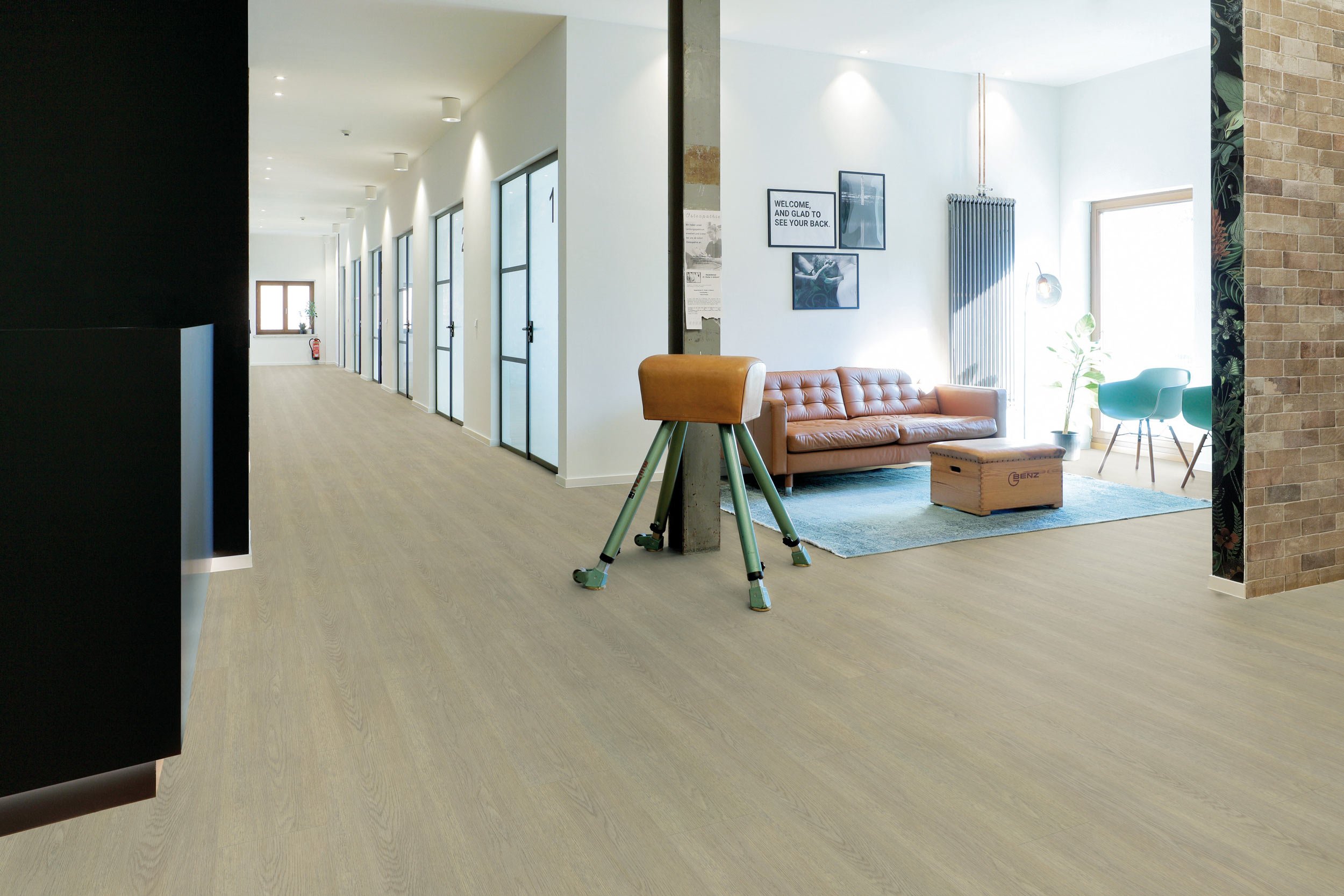 Det vesentlige er at dette er samme design i alle fire formater. Samme farge. Samme overflate. Ulike uttrykk. I praksis betyr det at du kan legge plank i korridoren og chevron i møterommet – og gå sømløst mellom dem. Overgangene blir naturlige fordi fargene allerede hører sammen. Bygget leser som én gjennomtenkt helhet, ikke en samling enkeltstående gulvvalg som tilfeldigvis er i omtrent samme nyanse.
