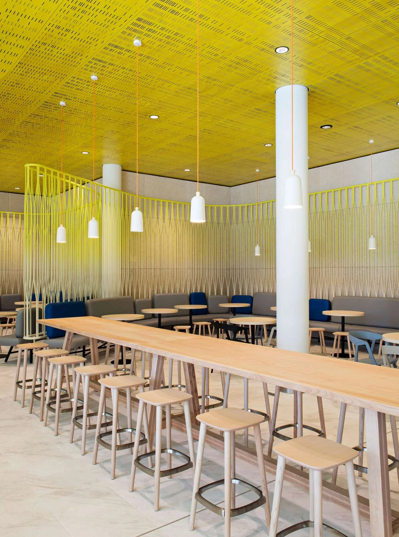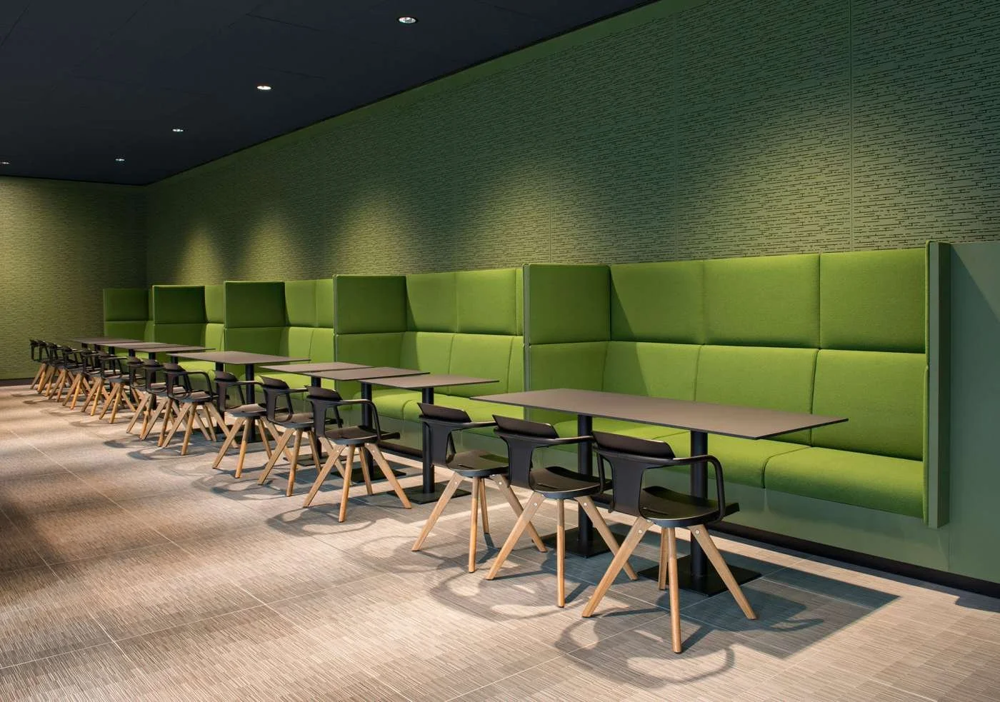 Bilder fra Société Générale campus i Frankrike. Med Obersound i designet Crackling og Pure Paper overflate Dark Olive 017 og Frequency i fargen Azure 016.