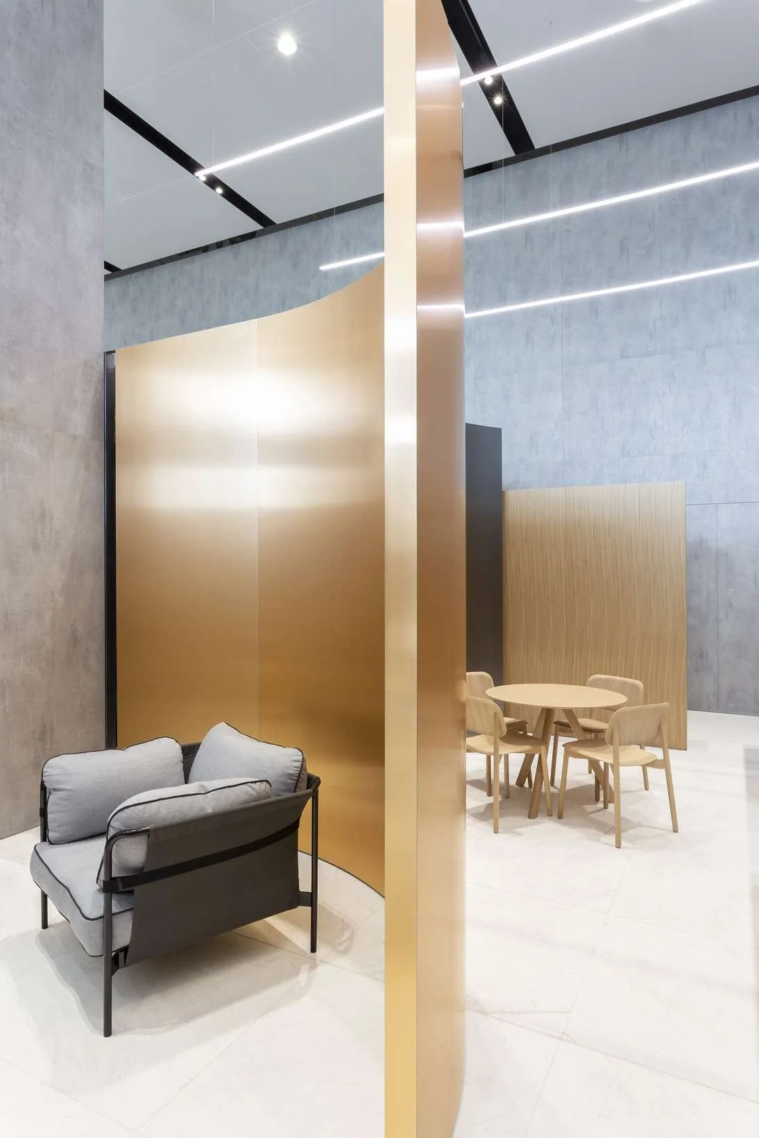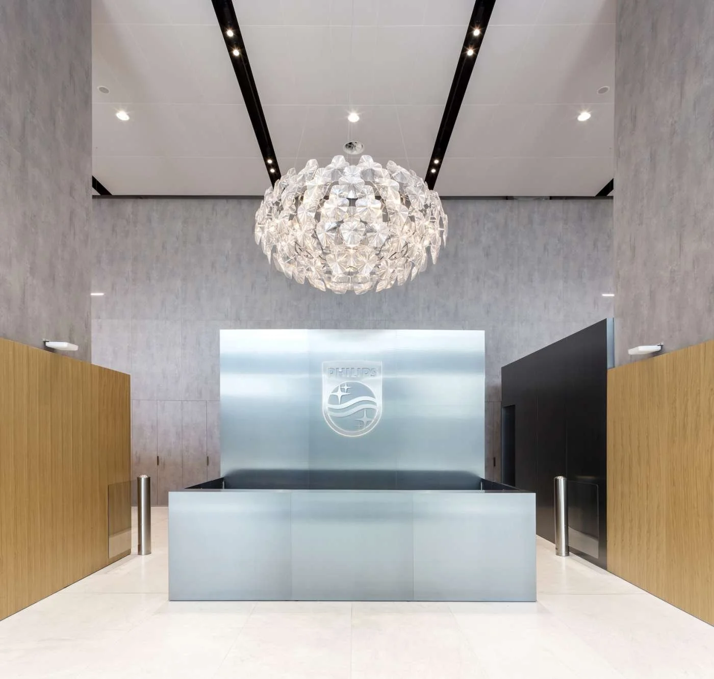 Fra Philips sitt hovedkontor i Milano. Pure Paper Metal i utførelsen Tin Mill Finish 723 og Copper Mill Finish 722 på vegger og resepsjonsmøbler.