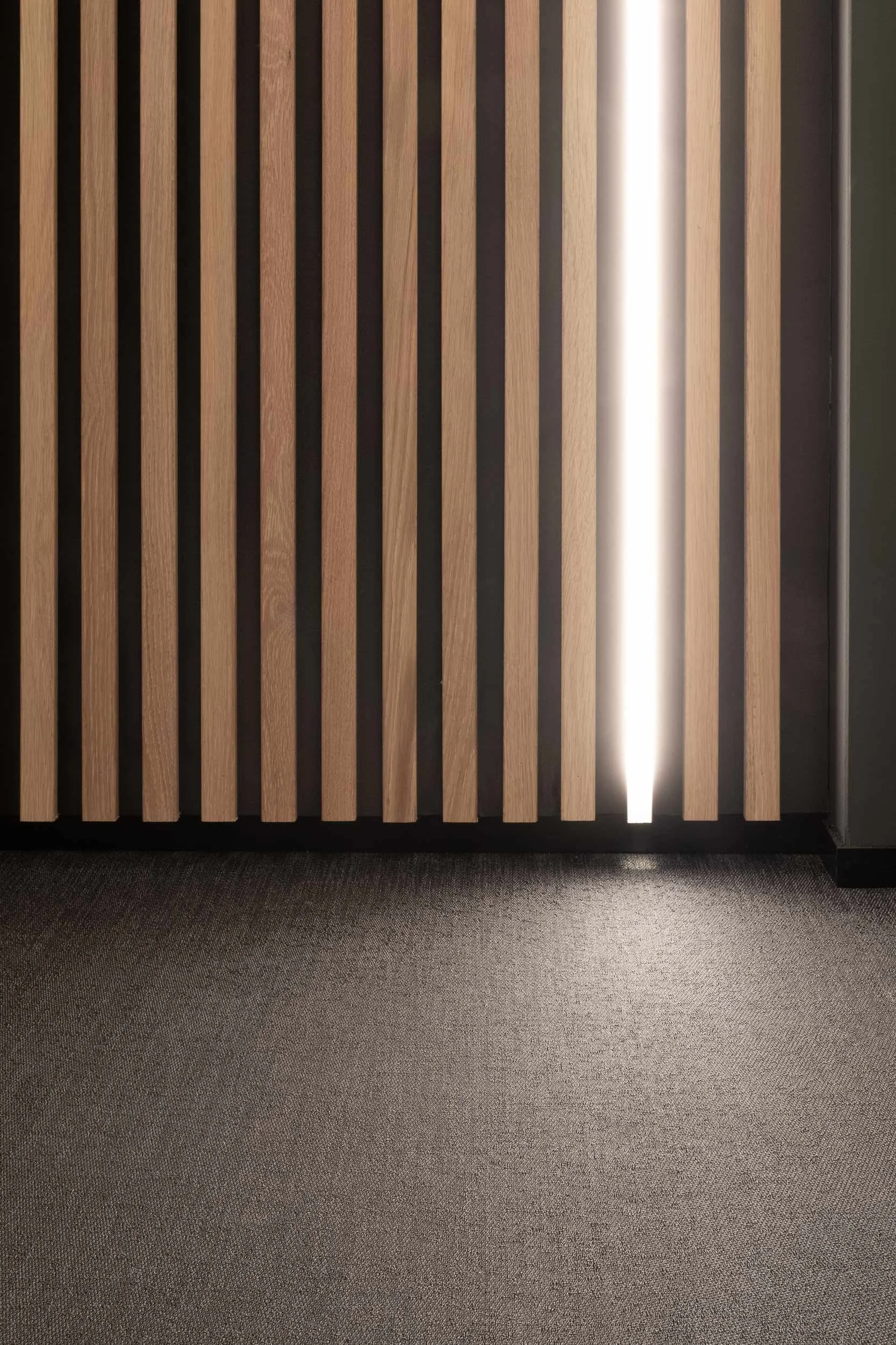 Selskapet er veletablert med glass -og systemvegger, samt himlinger og rekkverk. I Bjellandveien 26 på Vear i Vestfold har CreoNordic hovedkontor, showroom, lager og produksjon. Strømlinjeformet in-house verksted og 45 ansatte gir CreoNordic den store fordelen av å være fleksibel og skalerbar på samme tid. Showroomet er et moderne studio utformet med et bredt spekter av CreoNordics produkter. Her har vi levert vevd vinylteppe fra 2tec2, Milliken teppeflis og Weitzer Parkett. CreoNordics produkter av glass og aluminium er presisjonsprodukter med minimalt rom for feilmargin. Studioet reflekterer dette godt og i sonen som demonstrerer de ulike løsningene for glassvegger og dører ble det valgt vevd vinylteppe til gulvet. 2tec2s kolleksjon av vevde vinyltepper er laget med helt runde tråder med glassfiberkjerne, dette gir overflaten et stramt og moderne utrykk. Til CreoNordics studio leverte vi Seamless Tiles med 2tec2s akustiske feltbakside, som er standard på hele kolleksjonen. Som en kontrast til glass, aluminium og 2tec2 er en vegg og taket i korridoren kledd med spiler i naturlig treverk. Resultatet er et moderne og elegant utrykk, der de tekniske egenskapene er optimalisert og ivaretatt. Vi leverte 2tec2 i den brune fargen Orion og den sorte fargen Eclipse til CreoNordics studio. Disse fargene passer godt med CreoNordics egen kolleksjon da de er anvendelige bakgrunner som sluttbruker kan bygge identitet på med videre profilering og møblering.